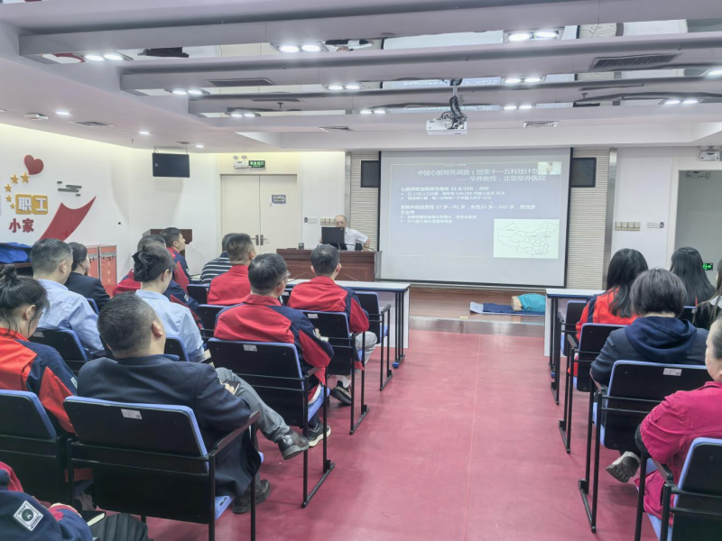 讲座中,赵医生首先聚焦心肺复苏(CPR)急救知识和自动体外除颤仪(AED)的使用技巧进行详细讲解。通过生动的案例分析和现场实操互动,让理论知识转化为可操作的技能。在心肺复苏演示环节,赵医生邀请现场员工借助模拟人教具,亲身实践胸外按压和人工呼吸操作。“按压深度要达到5—6厘米,频率保持在每分钟100—120次。”赵医生一边示范标准动作,一边纠正员工按压时的手势和力度。在AED使用教学中,赵医生结合模拟设备,对设备操作流程进行全流程拆解,从开启电源、粘贴电极片到依照语音提示实施除颤,每个步骤都进行了细致入微的演示。这种沉浸式实操互动模式,让员工们直观掌握了急救要点,现场学习氛围热烈浓厚。实用的急救知识使员工们具备了应对突发状况的能力,为守护生命安全构筑了坚实屏障。