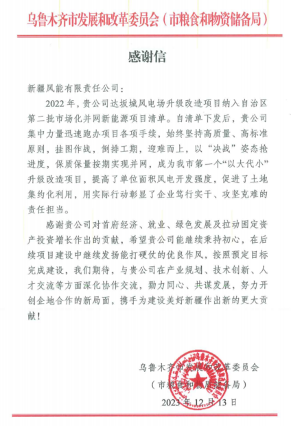 (通讯员 朱鑫鑫/摄影 龚俊屹)12月13日,风能公司收到乌鲁木齐市发展和改革委员会(市粮食和物资储备局)发来的感谢信,信中对风能公司达坂城升级改造项目在自治区第二批市场化并网新能源项目中保质保量保时完成并网,为首府经济、就业、绿色发展及拉动固定资产投资增长作出的贡献表示高度肯定和感谢。